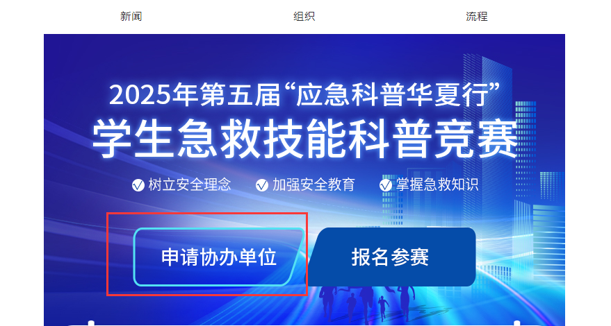 点击 http://jijiu.52jingsai.com 进入比赛官网,点击“申请承办单位”,按要求填写相关审核信息。审核通过后可获得本单位专属邀请海报,学生扫码参赛后会自动记录到本单位组织参赛人数中。